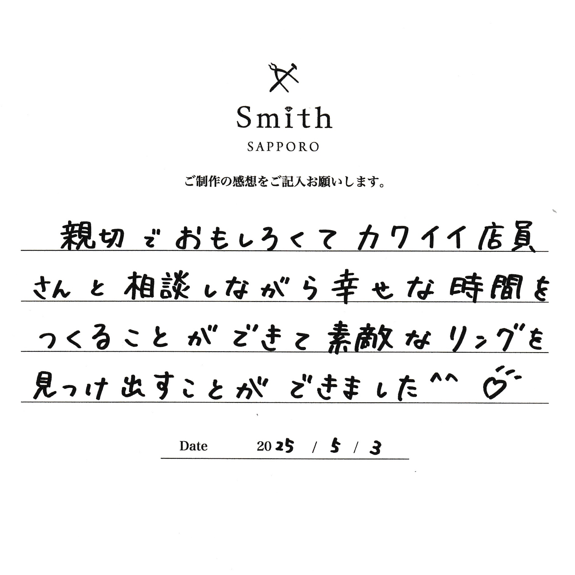 親切で面白くてカワイイ店員さんと相談しながら幸せな時間を作ることができて素敵なリングを見つけ出すことができました。