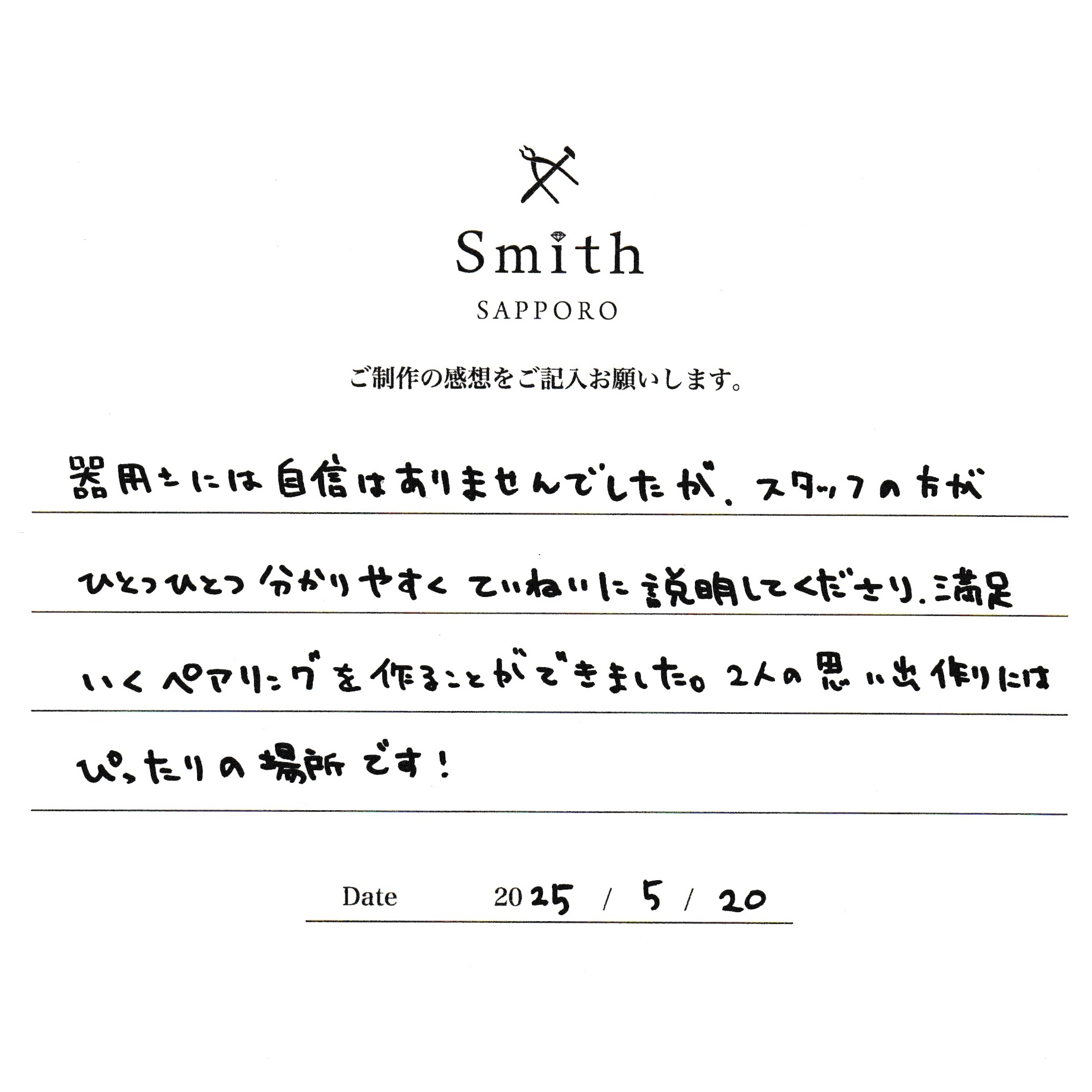 器用さには自信はありませんでしたが、スタッフの方がひとつひとつ分かりやすく丁寧に説明してくださり、満足いくペアリングを作ることができました。