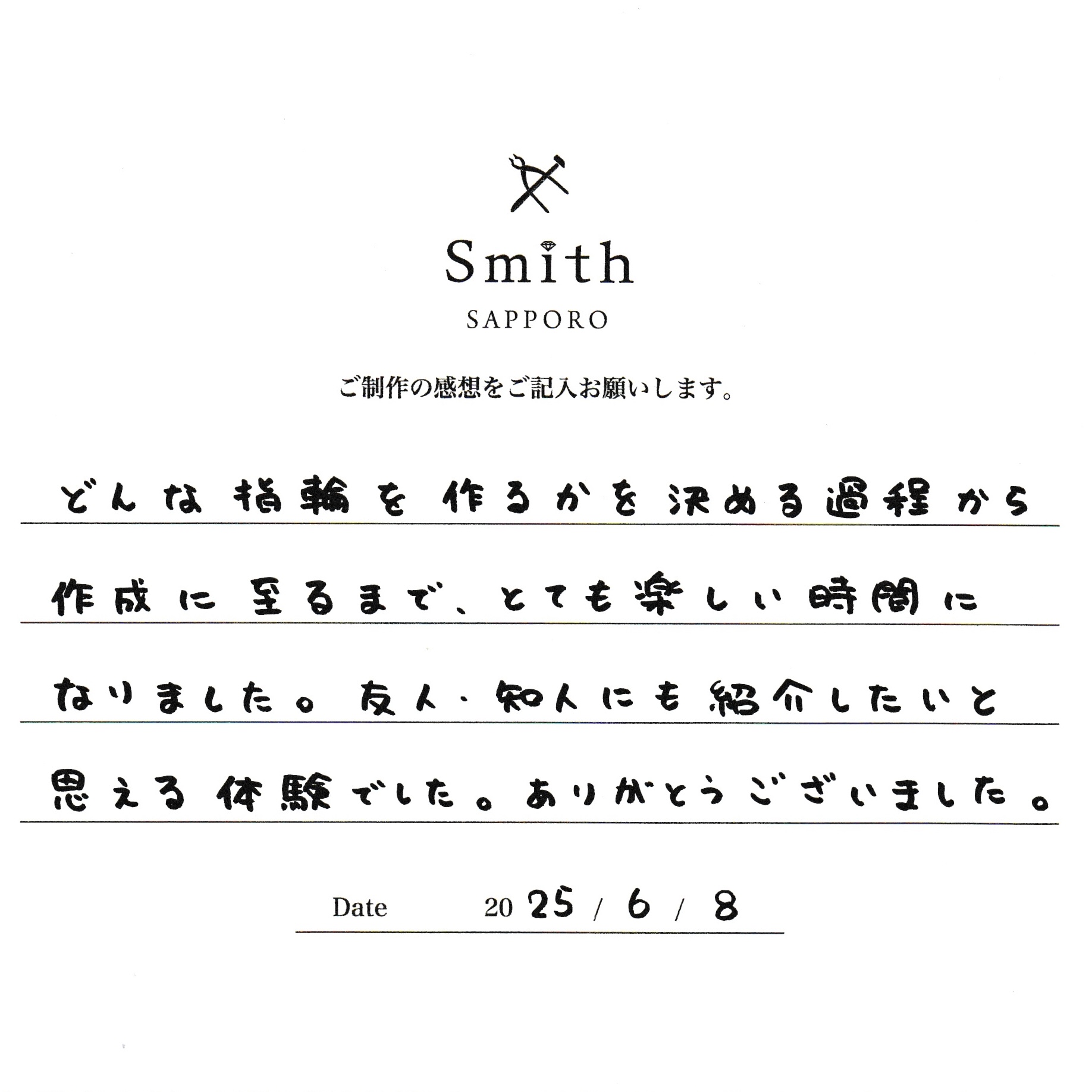 どんな指輪を作るか決める過程から作成に至るまで、とても楽しい時間になりました。