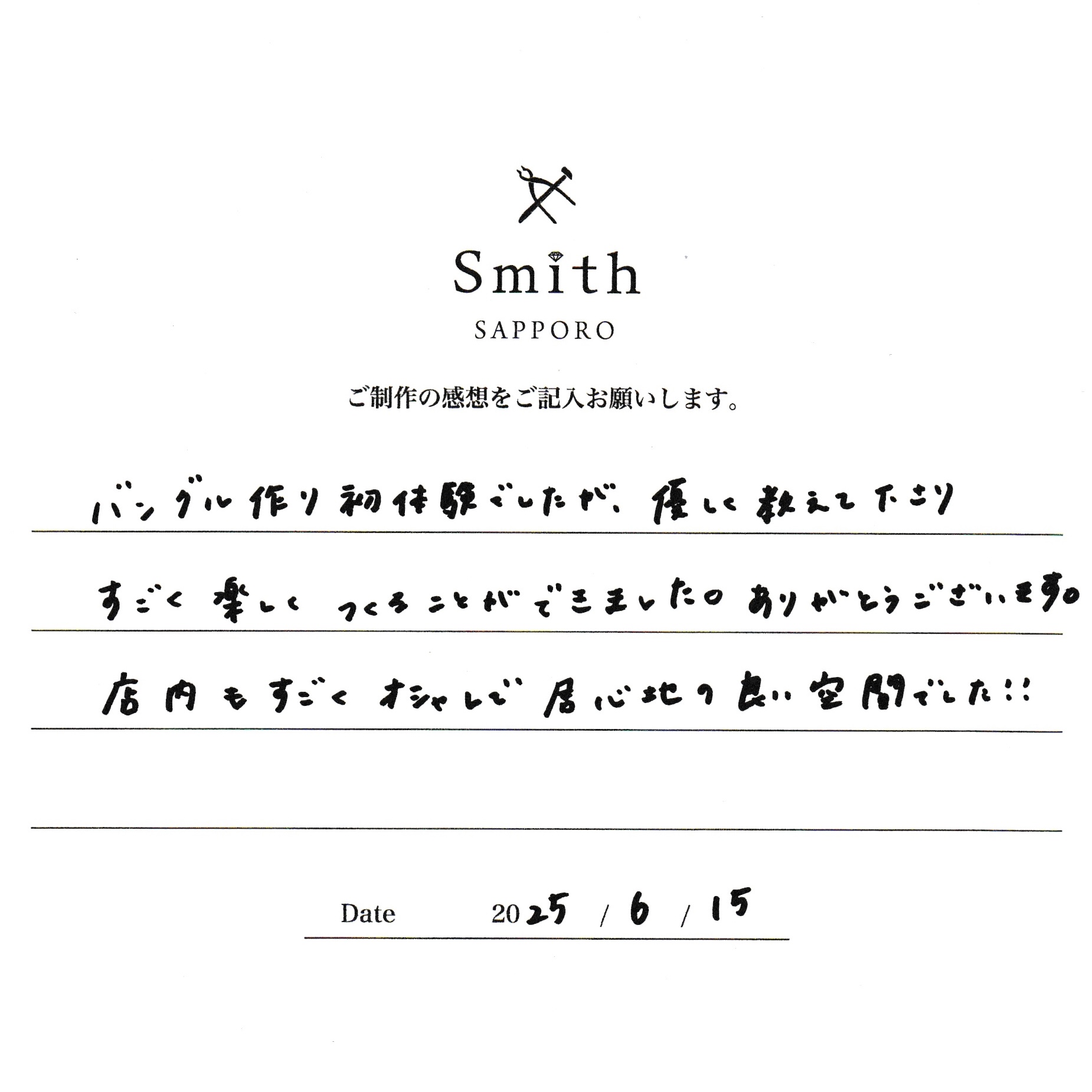 バングル作り初体験でしたが優しく教えて下さり、すごく楽しく作ることができました。ありがとうございます。