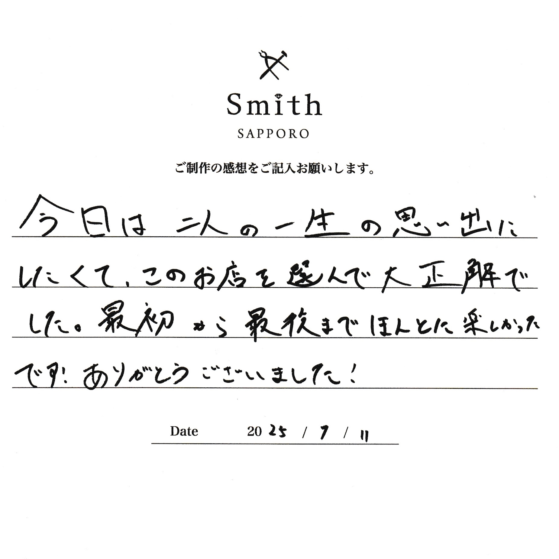 本日は数あるお店の中から大切なペアリングご制作に当店をお選びいただきありがとうございます。