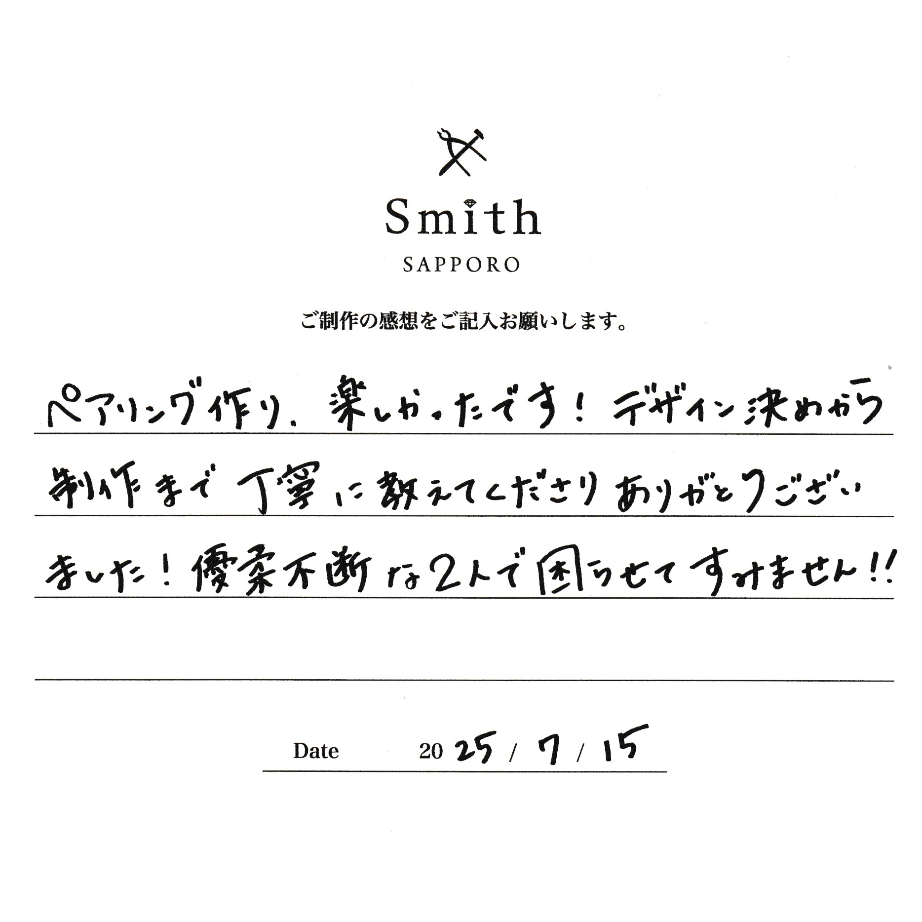 本日は数あるお店の中から大切なペアリングご制作に当店をお選びいただきありがとうございます。