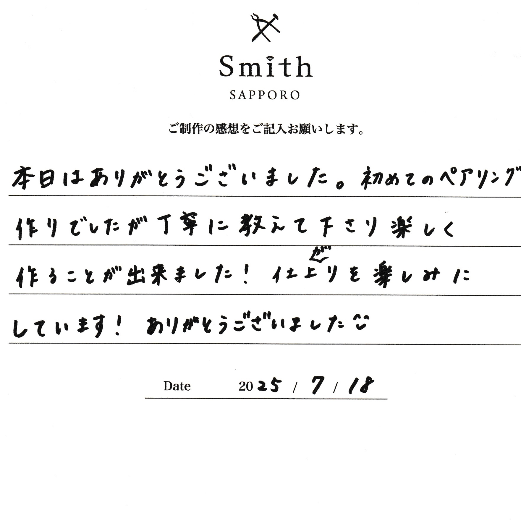初めてのペアリング作りでしたが、丁寧に教えてくださり楽しく作ることができました!