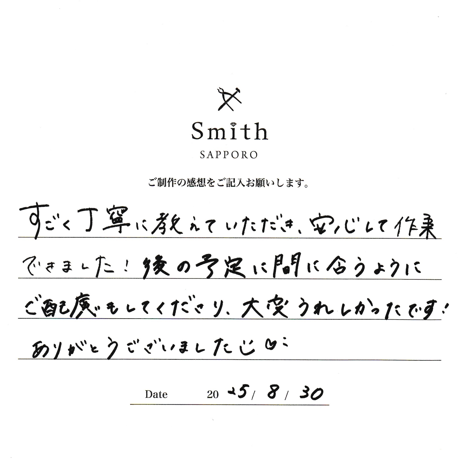 このたびは遠方から、手作り結婚指輪ご制作のために札幌までお越しいただき、誠にありがとうございました。