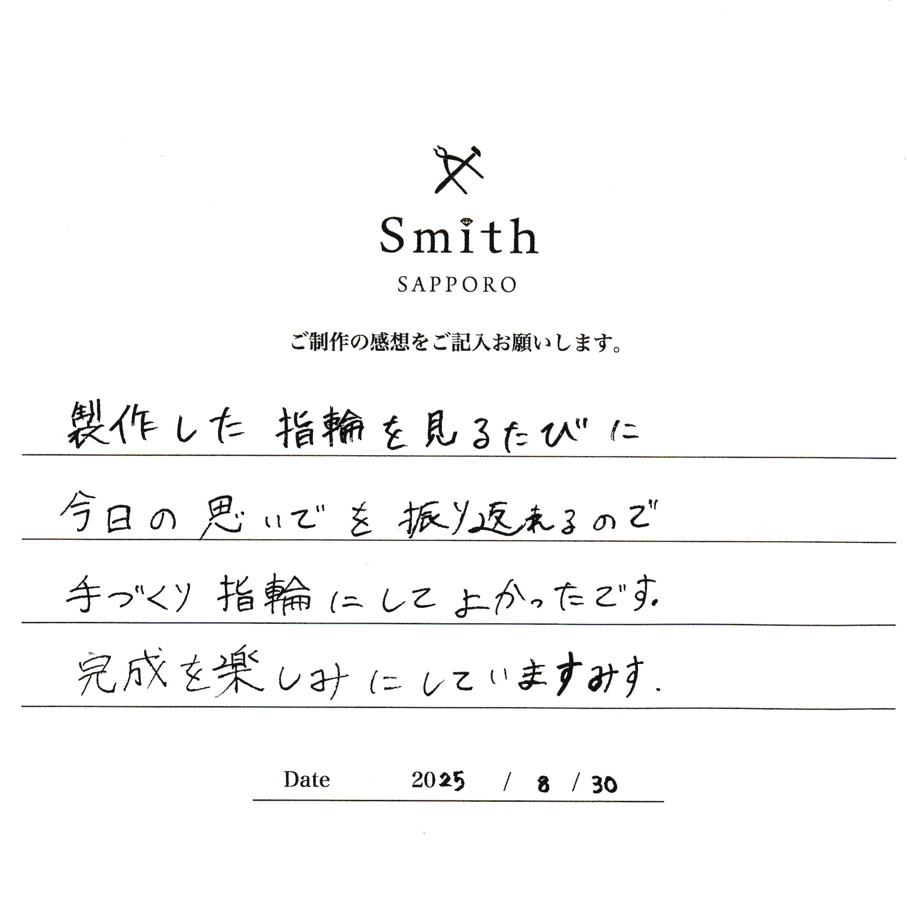 先日は、手作り結婚指輪の制作にご来店いただき、誠にありがとうございました。
