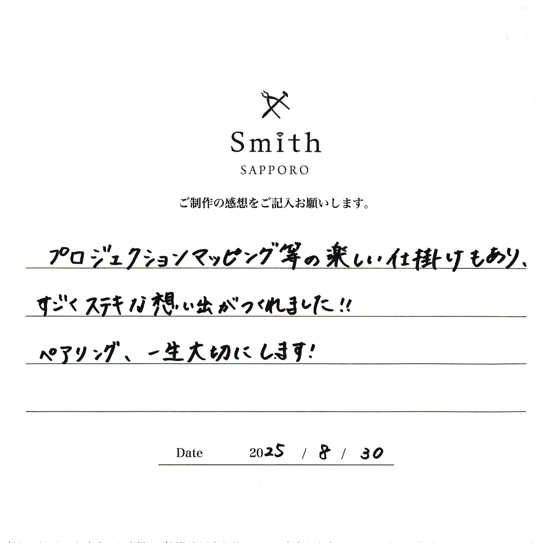 お付き合い1周年という特別な節目に、大切な指輪づくりをお任せいただけましたこと、大変光栄に感じております。