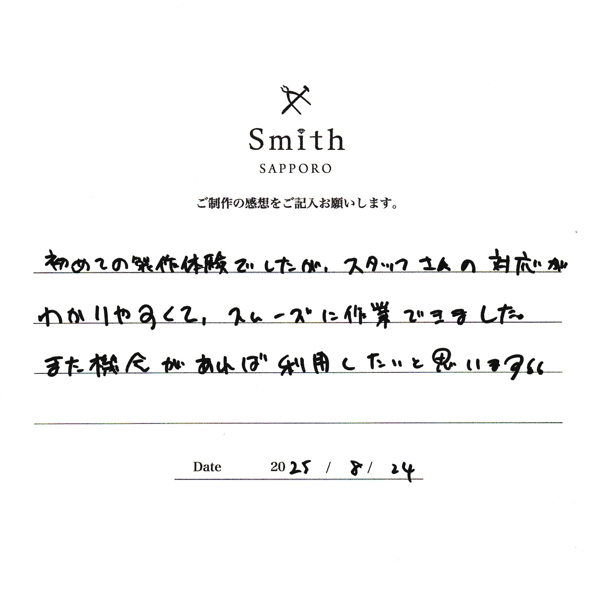 初めての制作体験でしたが、スタッフさんの対応が分かりやすくて、スムーズに作業できました。