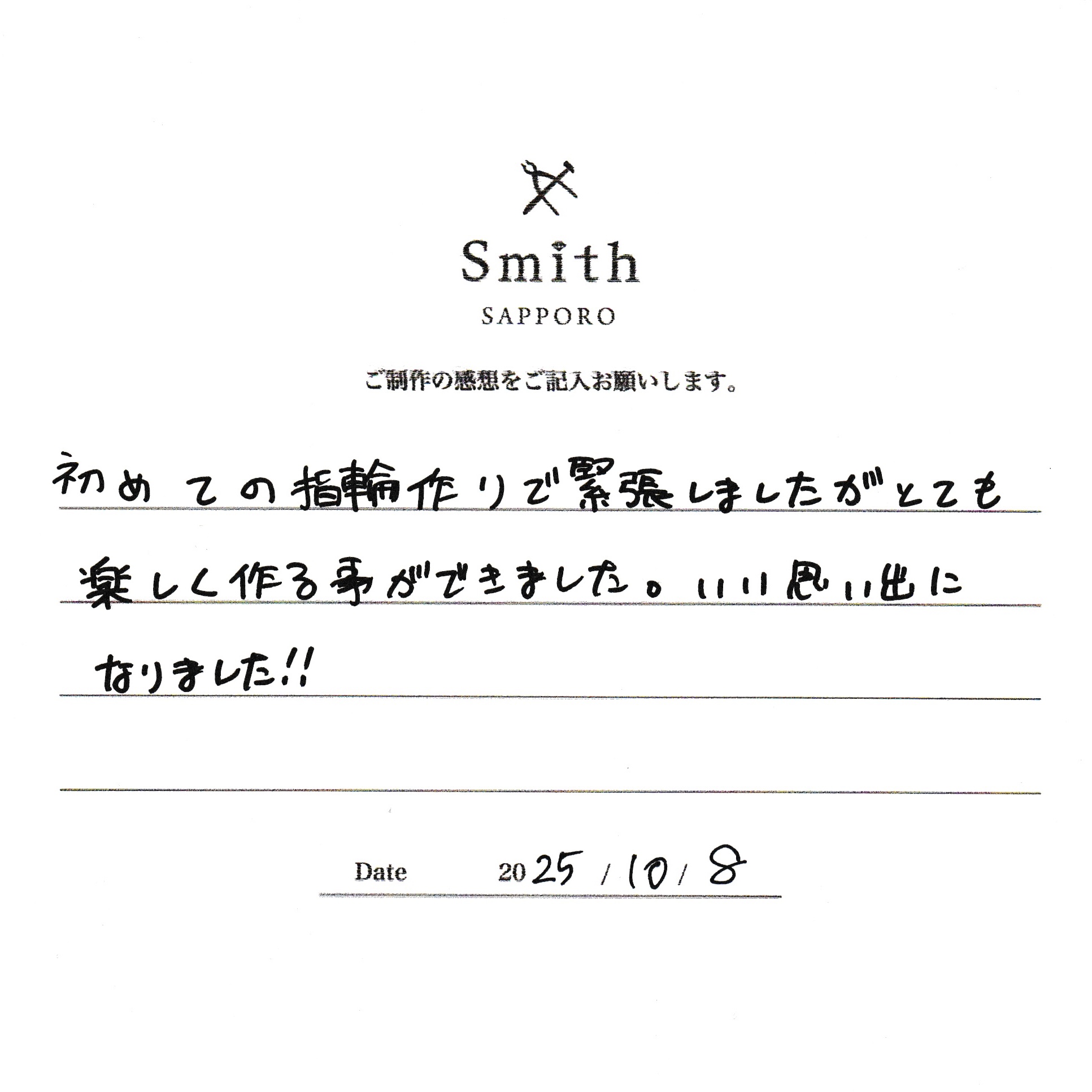 初めての指輪作りで緊張しましたがとても楽しく作る事ができました。