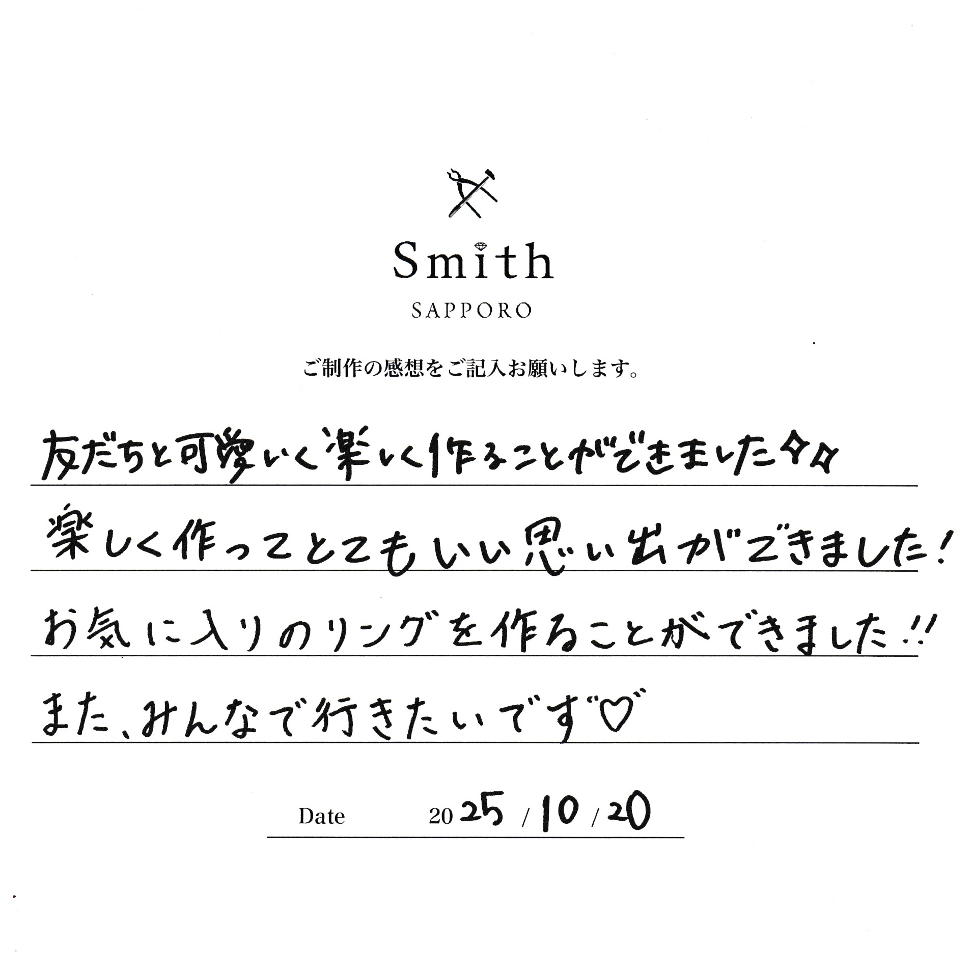 お気に入りのリングを作ることができました!また、みんなで行きたいです。