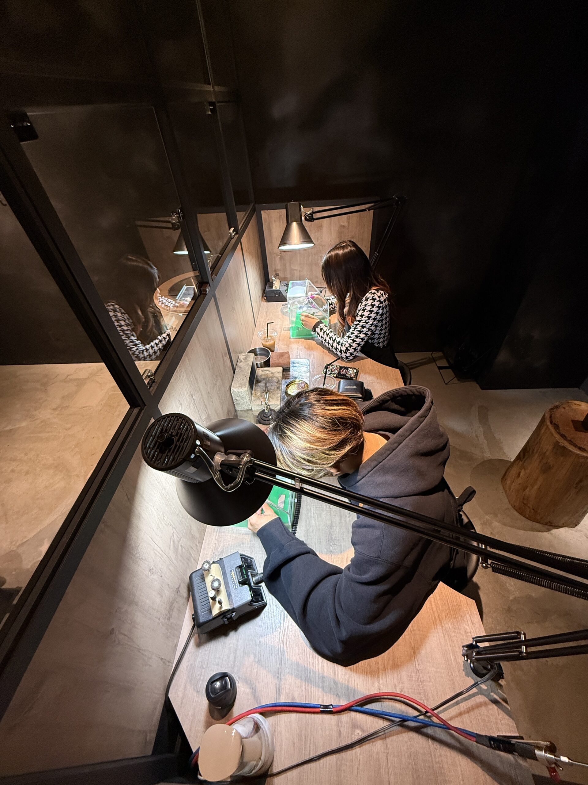 お二人でお揃いのデザインを照れくさそうに相談しながら決めていく姿がとても微笑ましかったです。制作中は真剣そのもので、不器用と言いつつも丁寧に取り組む姿に職人気質を感じました。