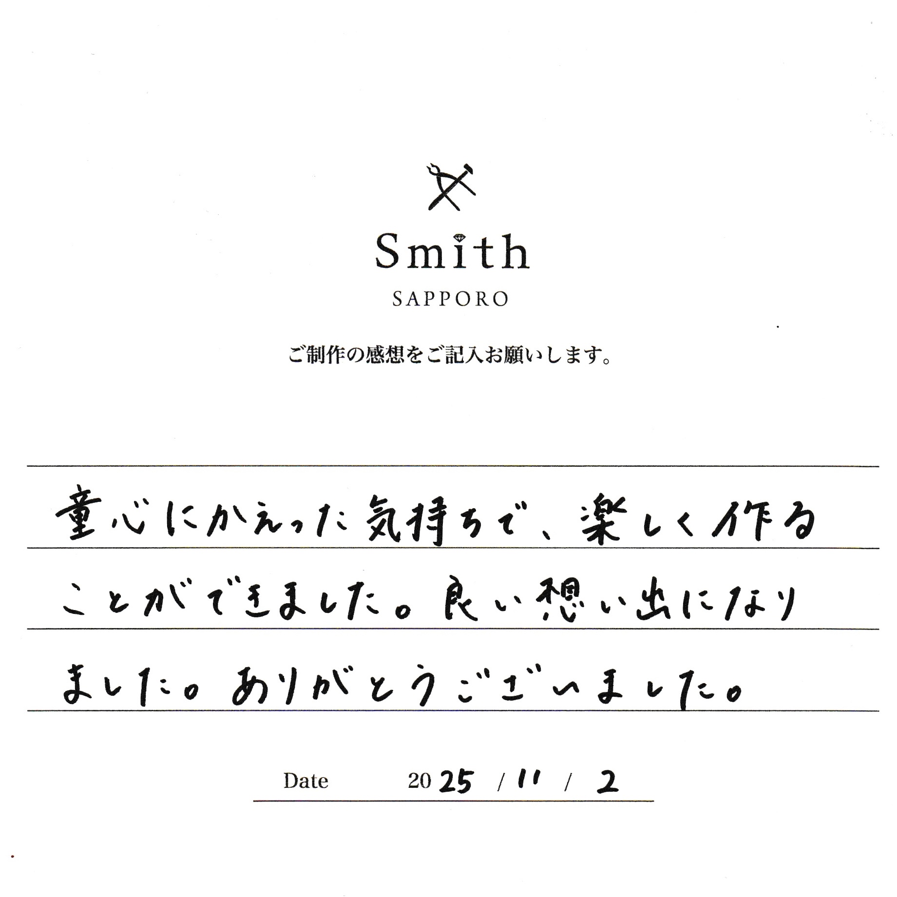 このたびは、手づくり結婚指輪の制作にお越しいただき、誠にありがとうございました。