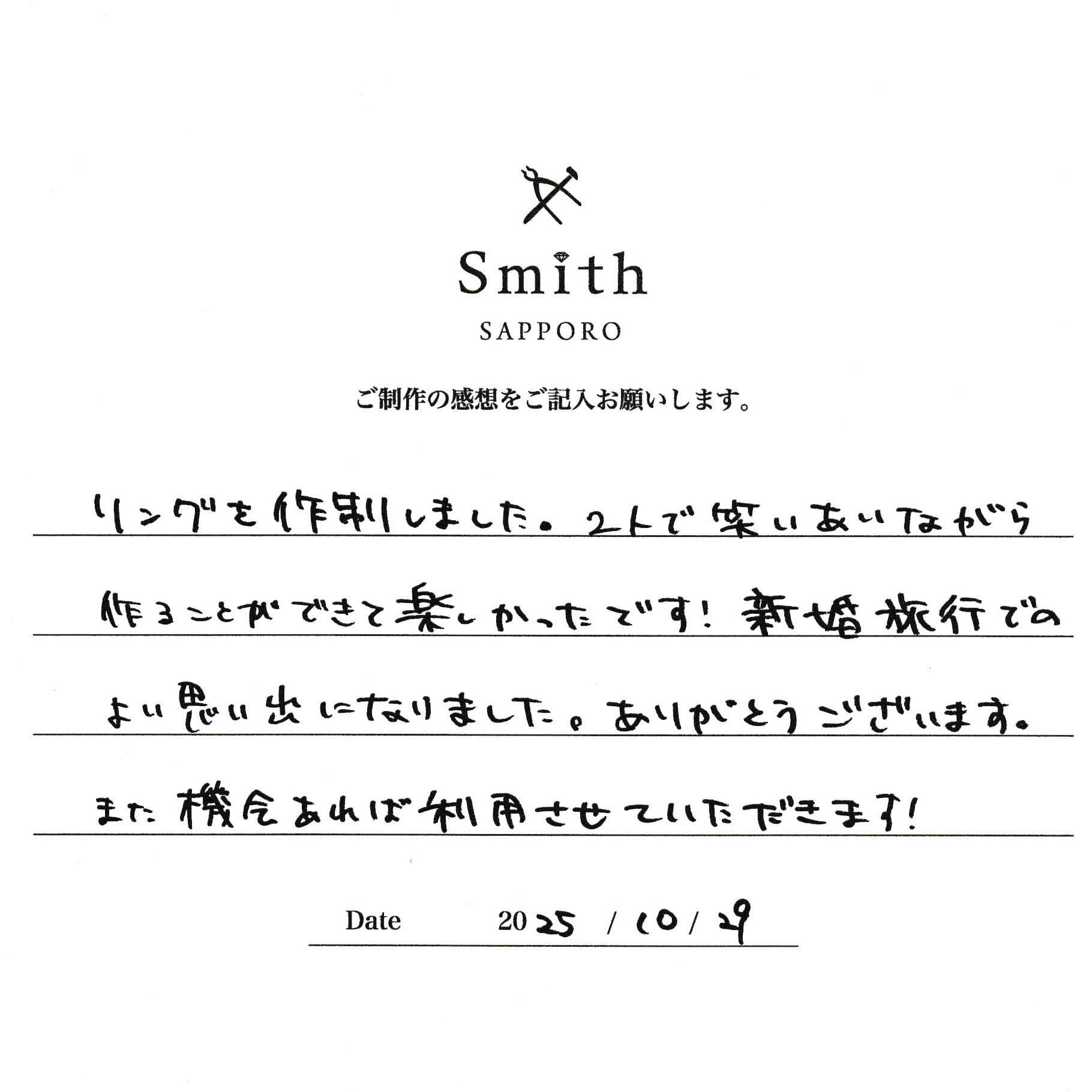 本日は数あるお店の中から大切なペアリングご制作に当店をお選びいただきありがとうございます。