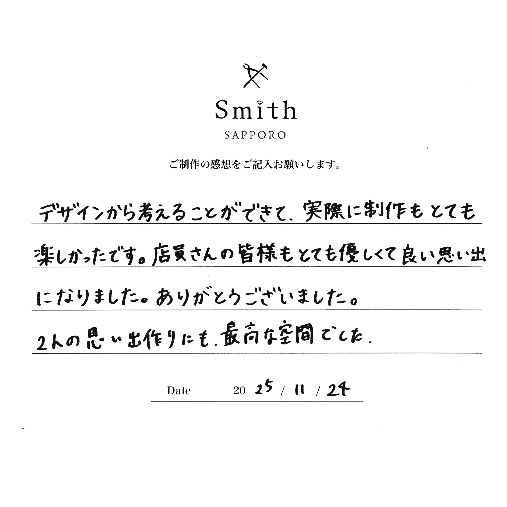 この度はご結婚指輪の制作のため「工房Smith札幌」にご来店いただき、誠にありがとうございました。
