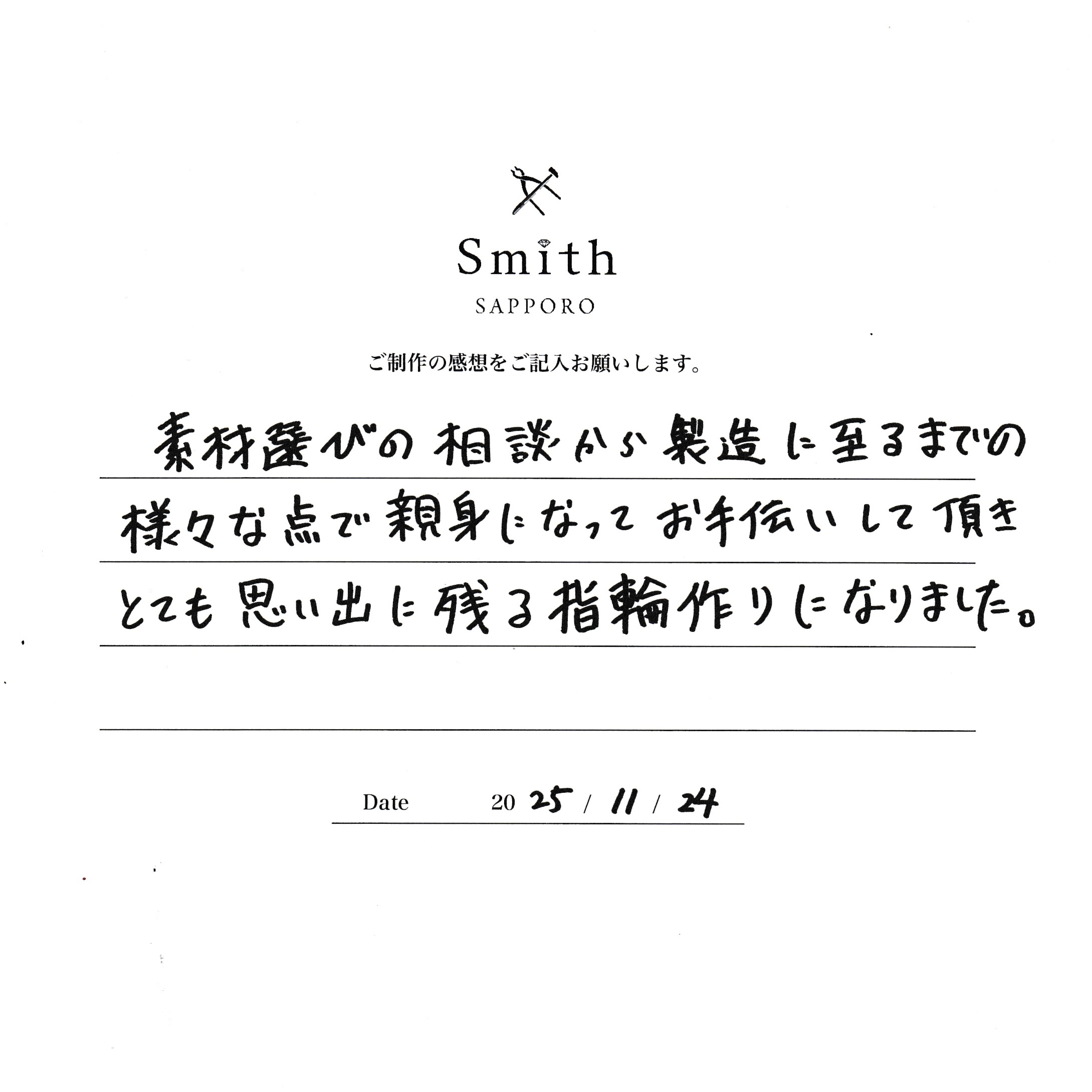 素材選びの相談から製造に至るまでの様々な点で親身になってお手伝いして頂き、とても思い出に残る指輪作りになりました。