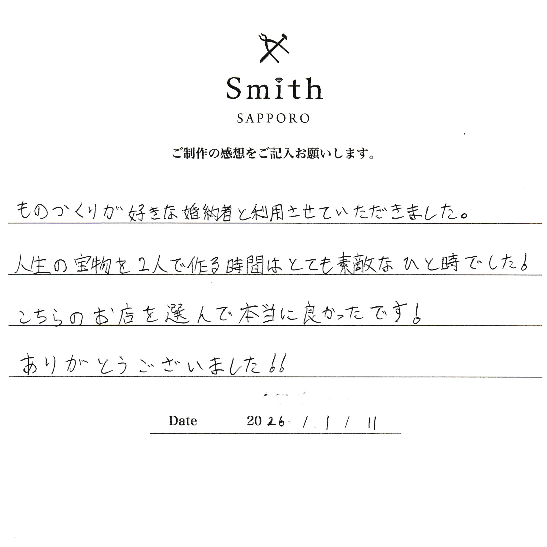 この度は、サプライズダイヤモンドプロポーズの成功をきっかけに、遠方より工房Smith札幌店へお越しいただき、心より感謝申し上げます。