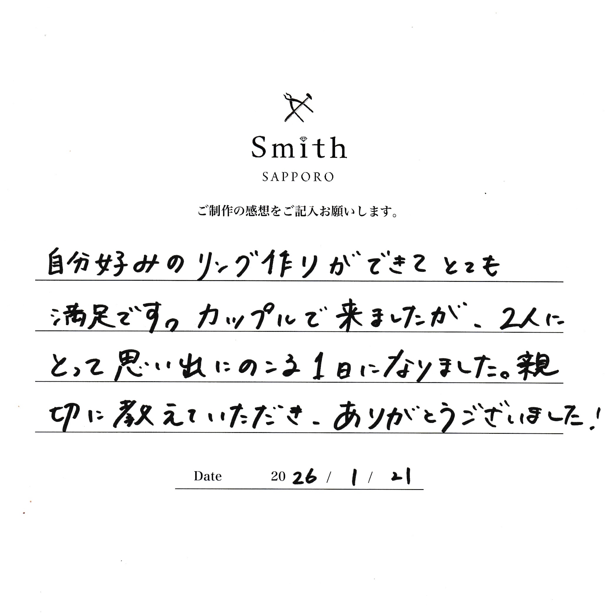 この度は、手作りペアリング制作にご来店いただきまして、誠にありがとうございました。