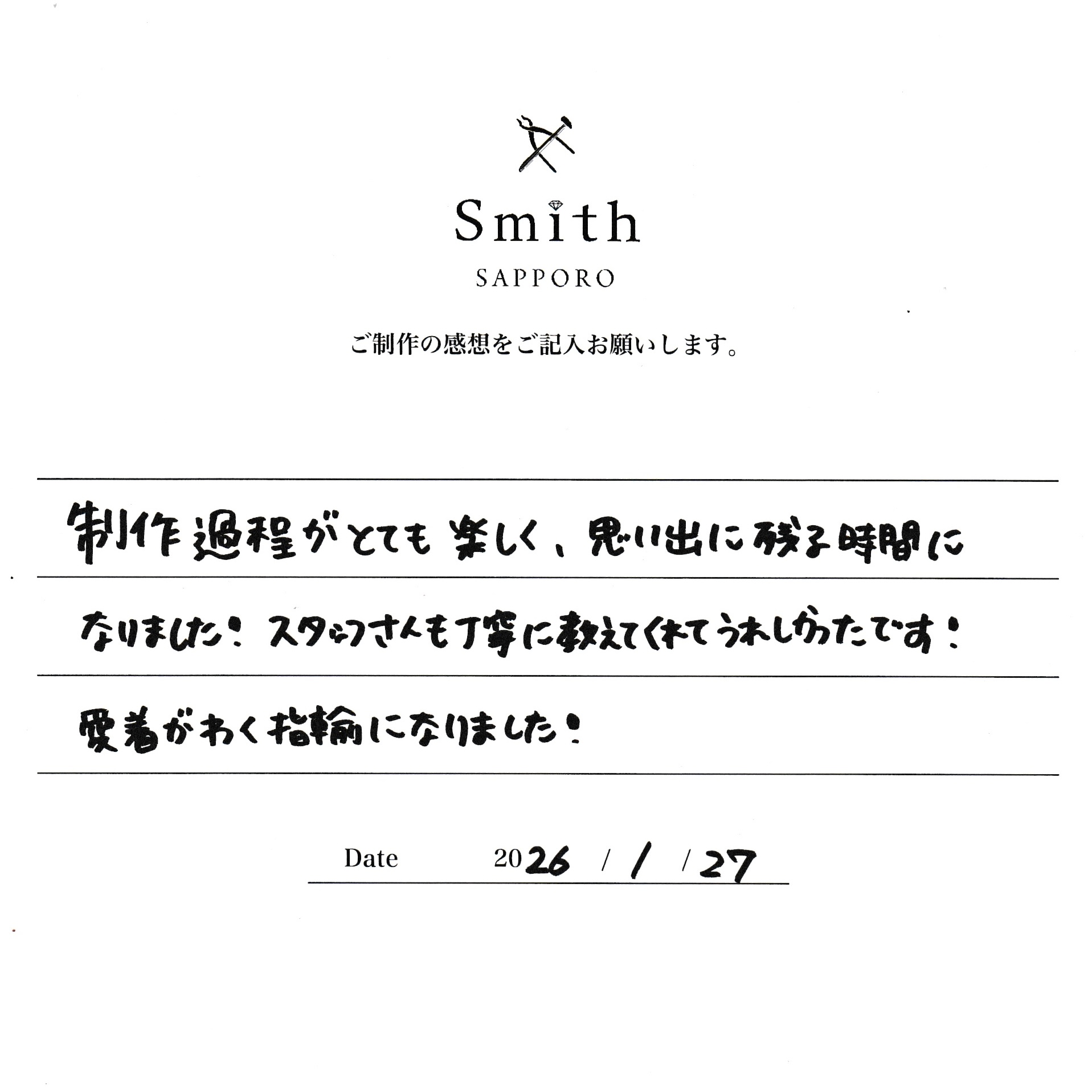 この度は手作り結婚指輪のご制作にお越しいただき、誠にありがとうございました。