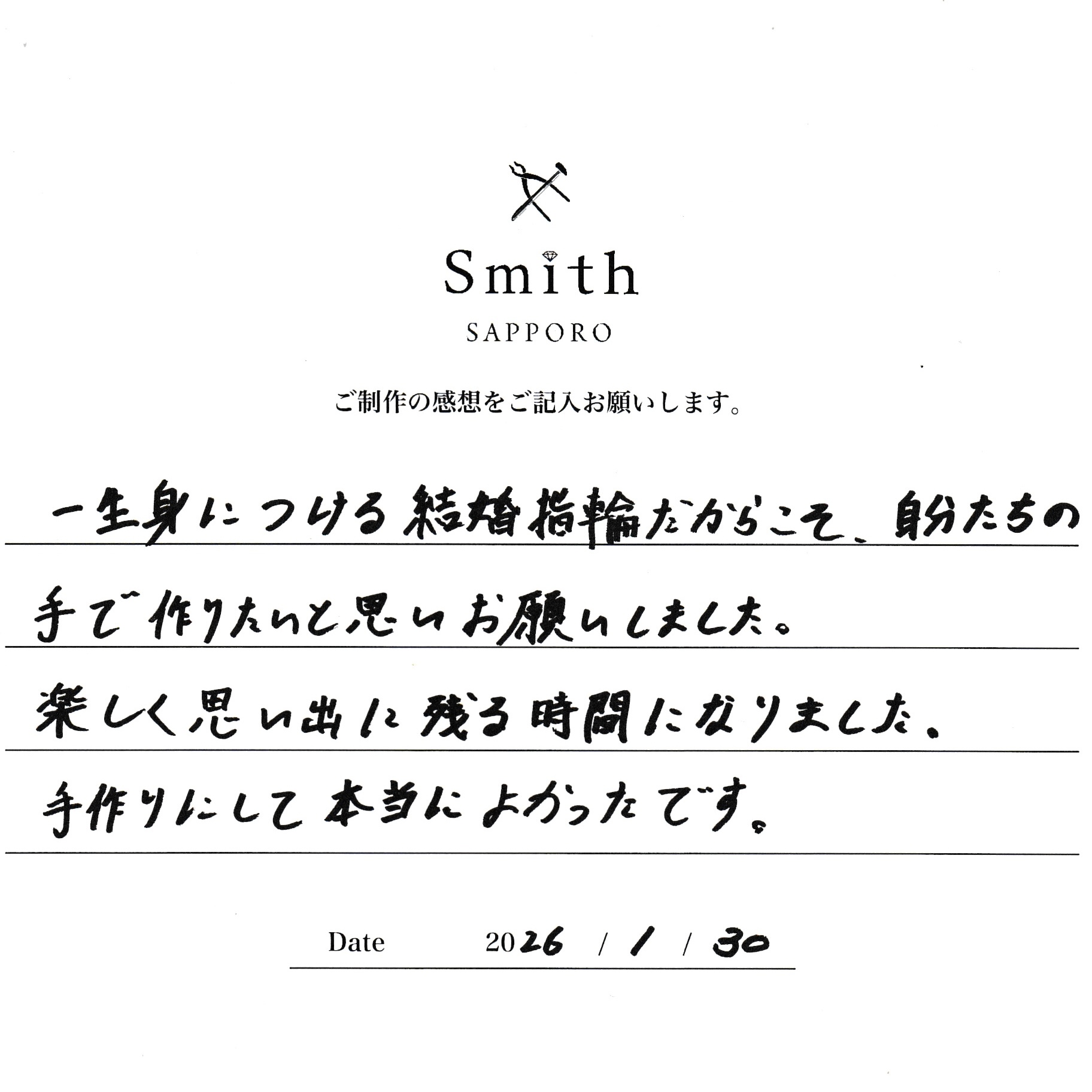 このたびは、工房Smith札幌店にご来店いただき、誠にありがとうございました。