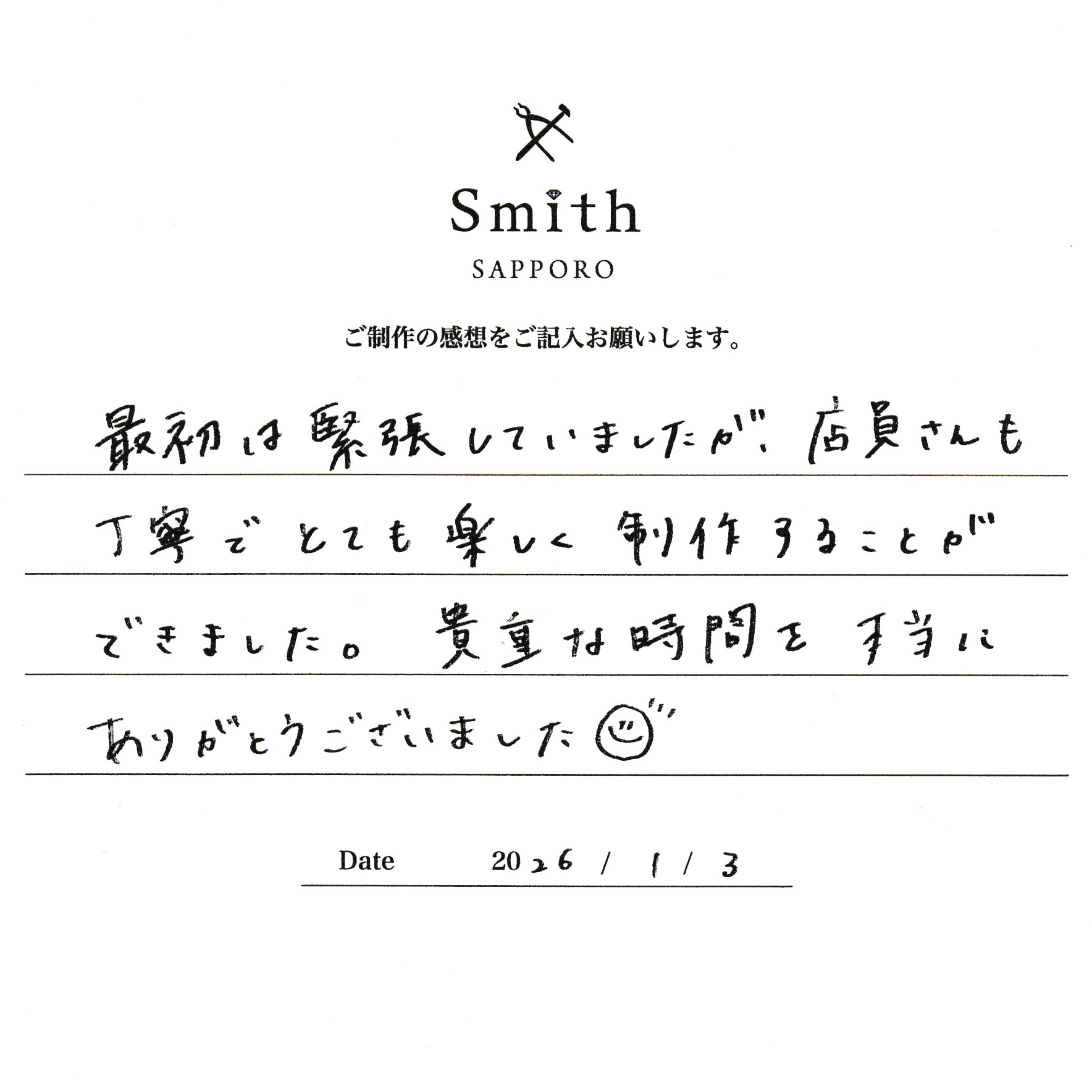 この度はペアリングの制作で工房Smith京王プラザホテル札幌店にご来店いただき、誠にありがとうございました。