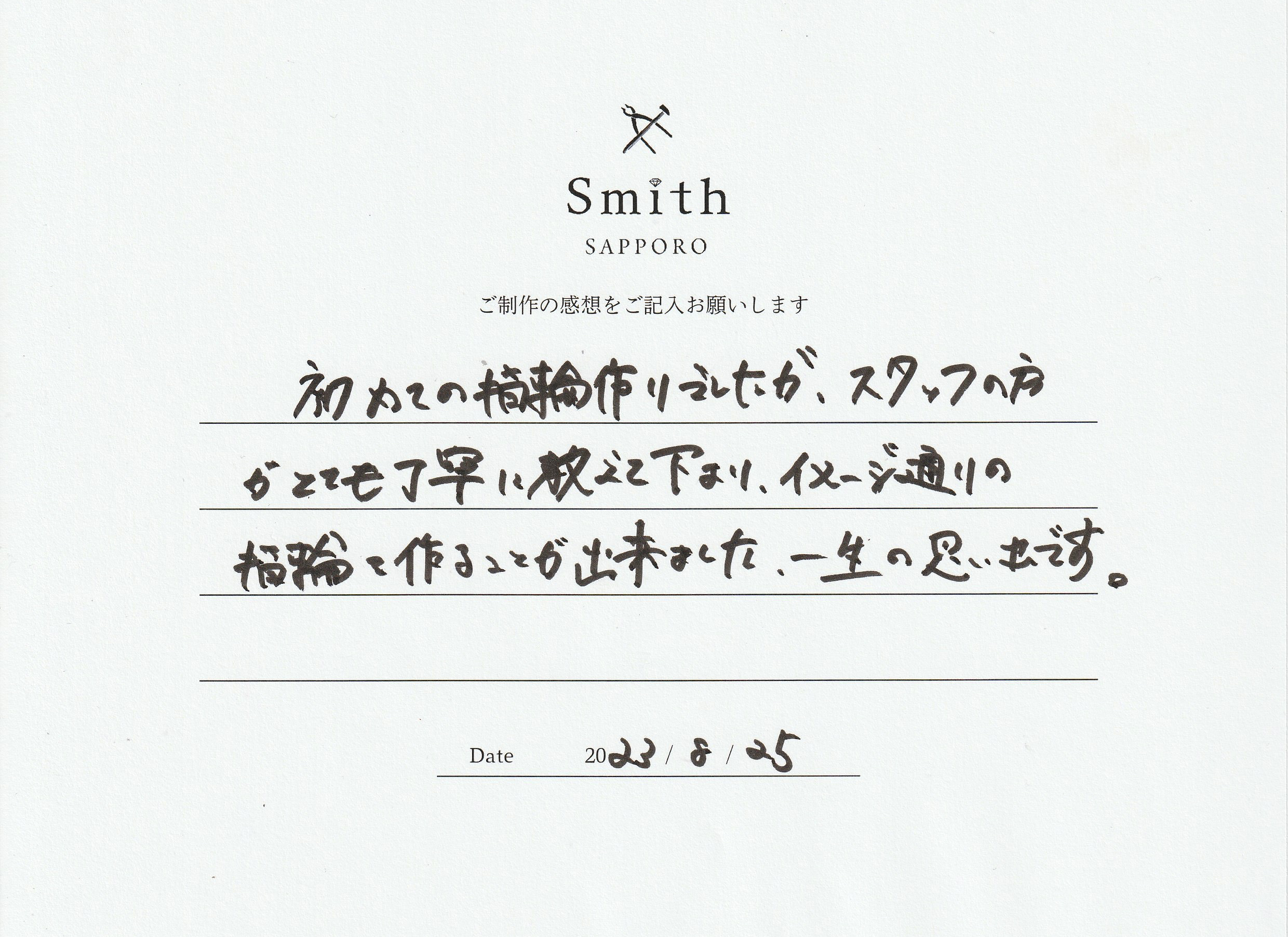 この度は工房スミス札幌店にて手作り婚約指輪をご制作いただいまして誠にありがとうございます。